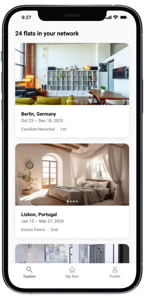 Changing the way you connect, share and find flats within your network. Build your web of friends to discover unique and trusted flats and transform the way you experience home-sharing.